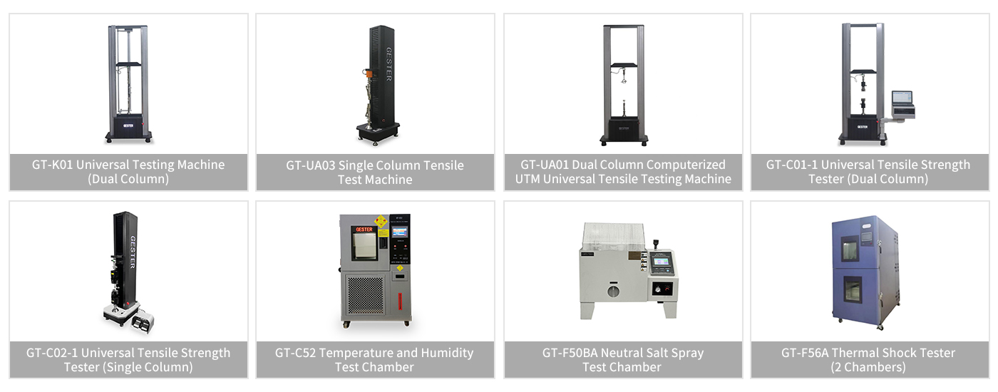 Included: single column tensile tester, dual column universal testing machine, temperature & humidity chamber, salt spray tester, thermal shock tester, rain test chamber, high low temperature test chamber